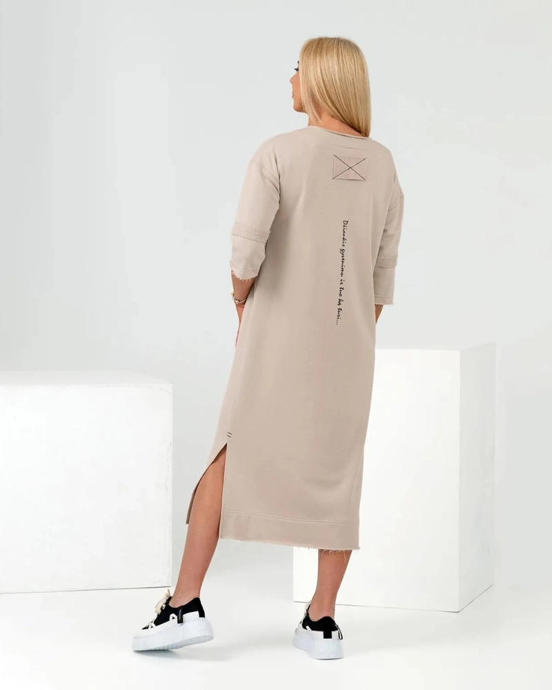 Susikurkite unikalų stilių! Ši laisvo silueto trikotažinė suknelė žavi patogumu ir išskirtinėmis detalėmis. Modelis pasižymi madingais „neapdorotais“ kraštais, 3/4 rankovėmis bei praktiškomis kišenėmis. Nugarą puošia vertikalus, įkvepiantis užrašas: „Džiaukis gyvenimu…“. Šoniniai skeltukai suteikia laisvumo judesiams. Tai idealus drabužis moterims, vertinančioms laisvę ir kokybę.